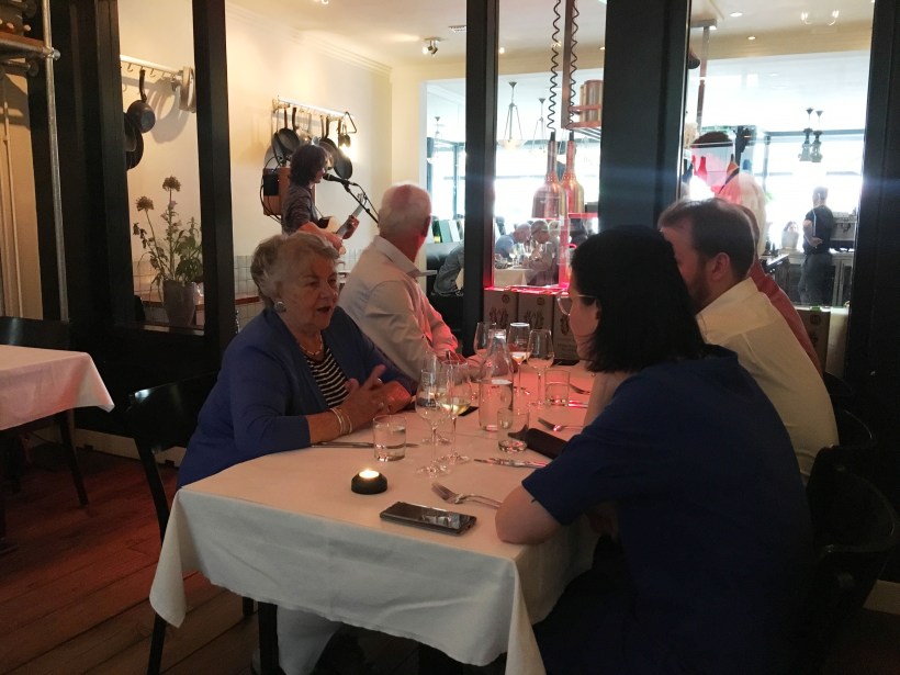 Na een heerlijk dessert van chocoladetaart met geslagen room en een coulis van rood fruit zat iedereen voldaan na te genieten onder het genot van een dampende koffie, espresso, cappuccino of thee. Papa Jeroen sprak een dankwoord uit naar de crew van De Keuken van Gastmaal, inclusief de nog niet genoemde Fraser die op zijn vrije avond vrijwillig de afwas deed. En uiteraard Dion, die ook volledig belangeloos de muziek verzorgde! Een luid applaus volgde.
