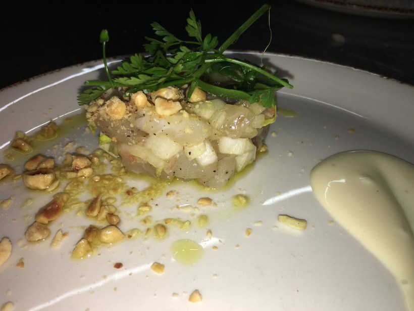 Om 18.00 kwamen de eerste gasten binnen en werden naar hun tafel begeleid. En toen begon het festijn. Het voorgerecht, malse zeebaarstartaar met witlof, hazelnoot en noilly prat mayonaise werd geserveerd onder de stemmige klanken van Dion Cooper, onze huistroubadour van deze avond. Daarna volgde een vegetarisch gerecht van schorseneren, pastinaakcrème, een gepocheerd eitje en hollandaisesaus saus. Het hoofdgerecht was een heerlijke runderhaas in kalfsjus met een lentestampotje en sperziebonen, afgemaakt met een lekker broodje achteraf om in de overheerlijke jus te deppen. Het kon niet op!