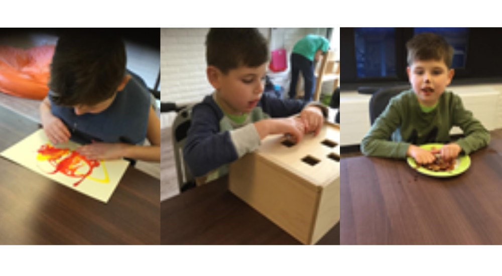 In de middag kiezen we vaak voor een sensopathische activiteit in combinatie met enkele werkjes aan de tafel. We doen dan onder andere, verf werkjes maken, lekker snoezelen met scheerschuim of knetterzeep of flink kliederen en smullen met een koken /bakken activiteit. Morris geniet dan van de ingrediënten die we op de tafel neerleggen, suiker, meel, speculaaskruiden of chocoladesaus. Als alles weer schoon is maken we nog enkele werkjes aan de tafel.