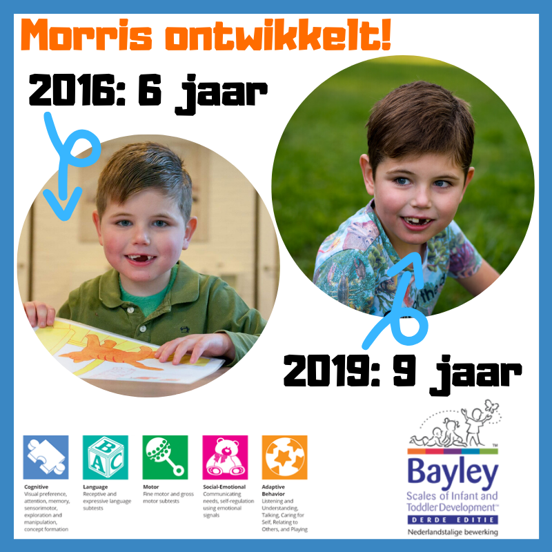 De uitslag was dat Morris een cognitieve ontwikkelingsleeftijd heeft van 14 maanden. Voor gewone kinderen is dat maar een klein stapje, maar voor Morris een enorme! Morris ontwikkelt, dat is het allerbelangrijkste. Hij volgt zijn omgeving en doet alles in zijn eigen tempo, op zijn eigen manier.